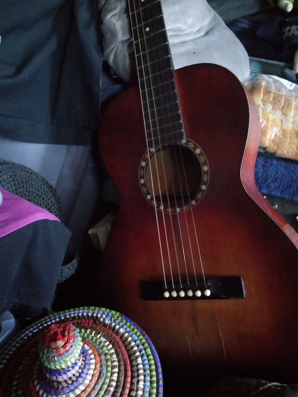 Acquired under dubious circumstances in a back country thrift store, and with all ornamentation (including her name in all its misspelled glory at the tuning pegs) stencilled on, a big safety pin holding her strings up off the neck far enough to be played without buzzing and, yes, cracks in her woodwork, she still outperforms sisters twice her size and ten times her asking price upon the fateful day on which this poet, as they say, “first laid eyes on ‘er.”